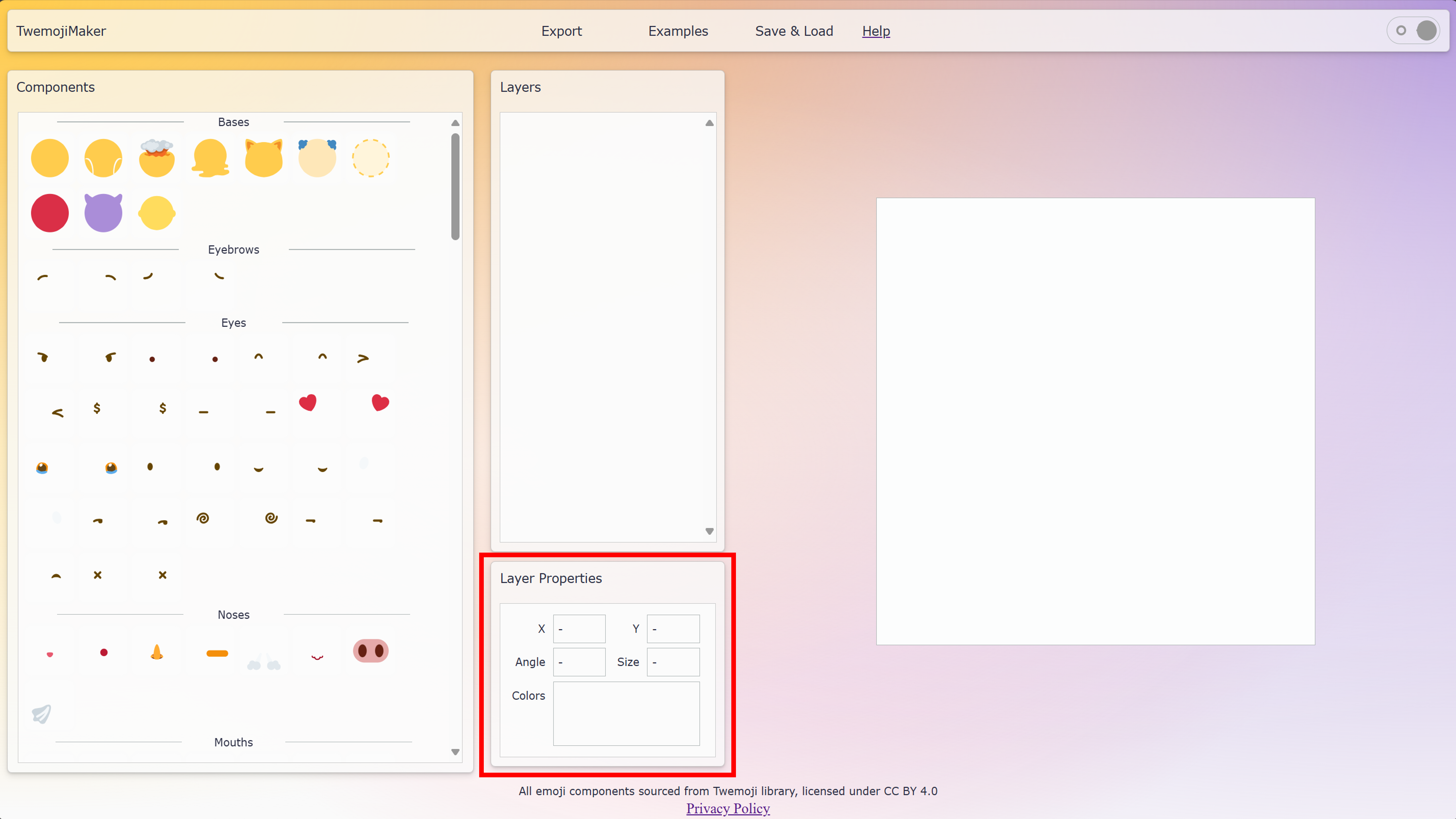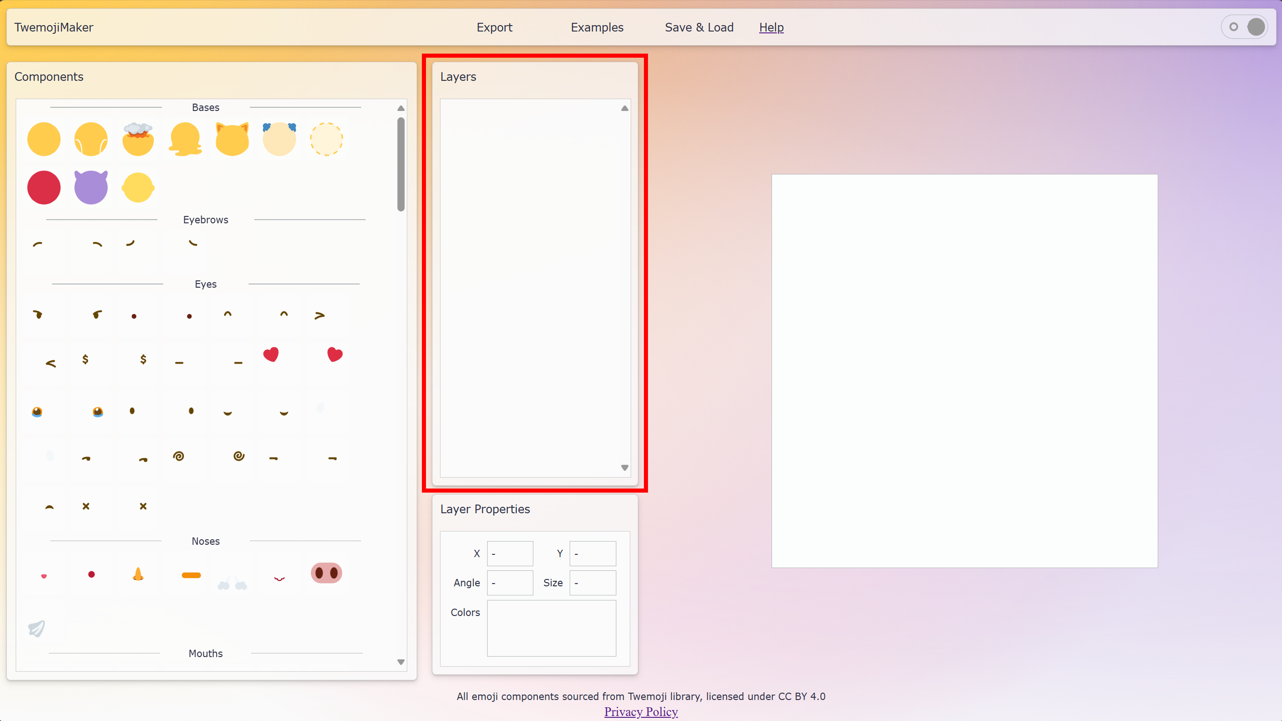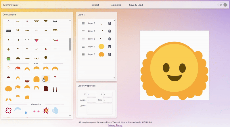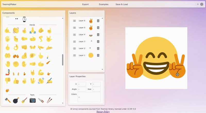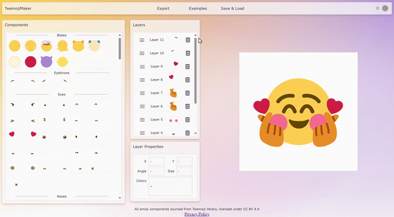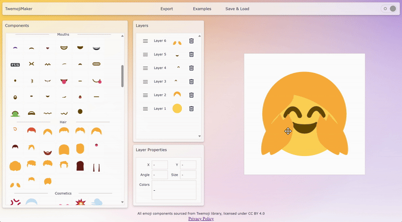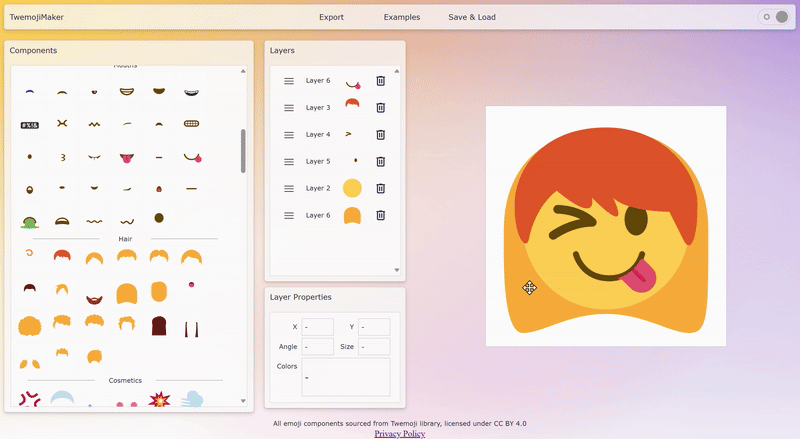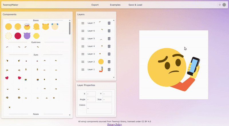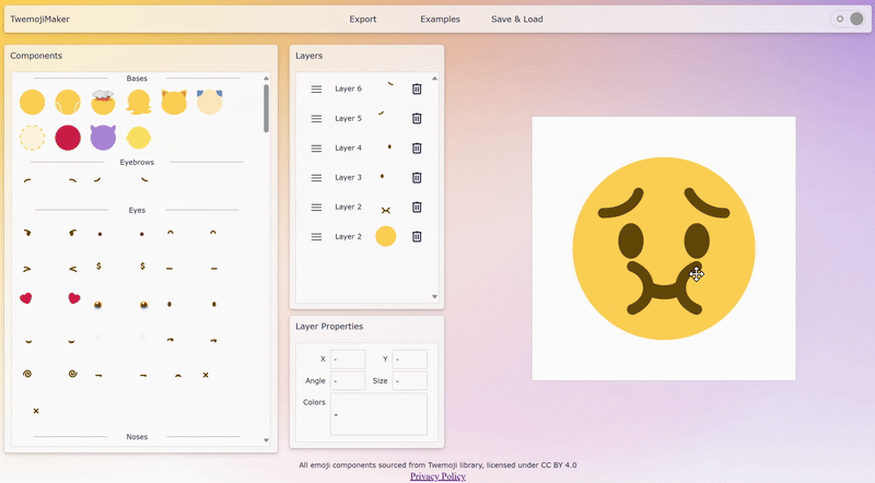 To change the order of components in the emoji, click and drag the three horizontal bars up or down in the Layer Properties Panel.