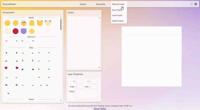 The Menu Bar lets you save, load, delete, and export projects you work on.